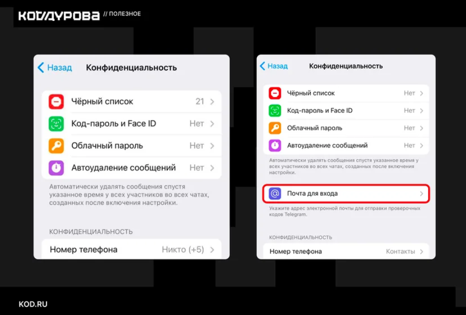 Теперь пользователи могут получать коды авторизации по e-mail. С 31 октября Telegram начал постепенно включать эту возможность для российских аккаунтов. Проверить наличие функции можно в разделе «Настройки → Конфиденциальность → Почта для входа».