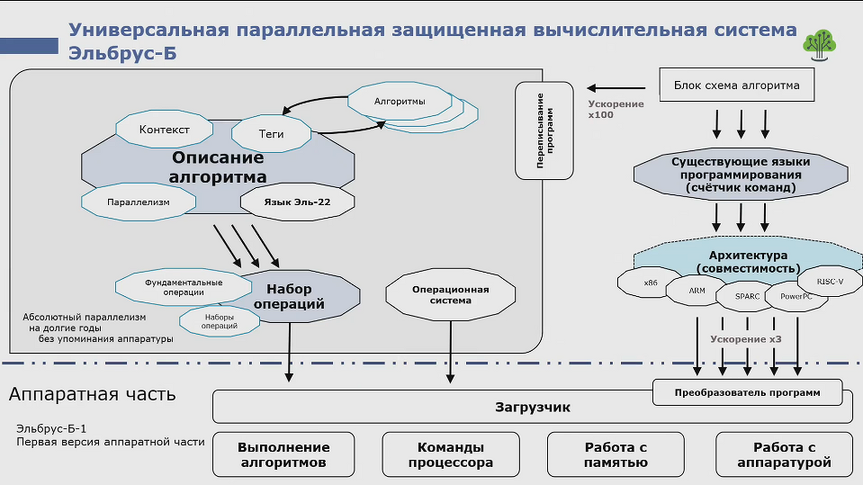 Основой «Эльбрус-Б» станет архитектура, ориентированная на параллельные вычисления. Она объединяет не только аппаратную платформу, но и собственный язык программирования, а также операционную систему, что обеспечивает выполнение множества задач одновременно и значительно увеличивает производительность.