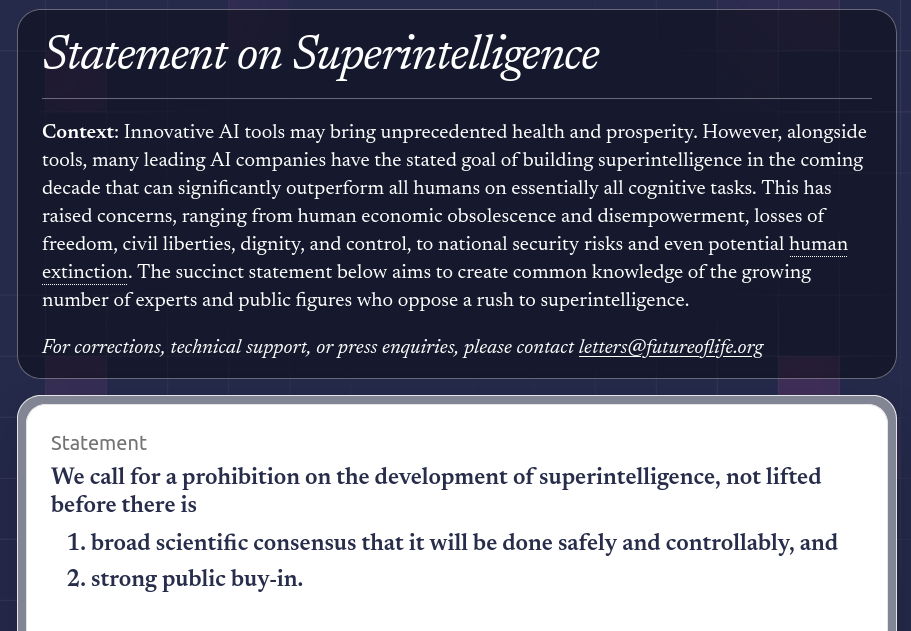 Документ под названием Statement on Superintelligence был подготовлен организацией Future of Life Institute (FLI). Среди подписавших — «крёстные отцы ИИ» Джеффри Хинтон и Йошуа Бенджио, соучредитель Apple Стив Возняк, основатель Virgin Group Ричард Брэнсон, бывший советник Дональда Трампа Стив Бэннон, экс-глава Объединённого комитета начальников штабов США Майк Маллен и другие известные личности. Поддержку инициативе также выразили герцог и герцогиня Сассекские, Гарри и Меган.