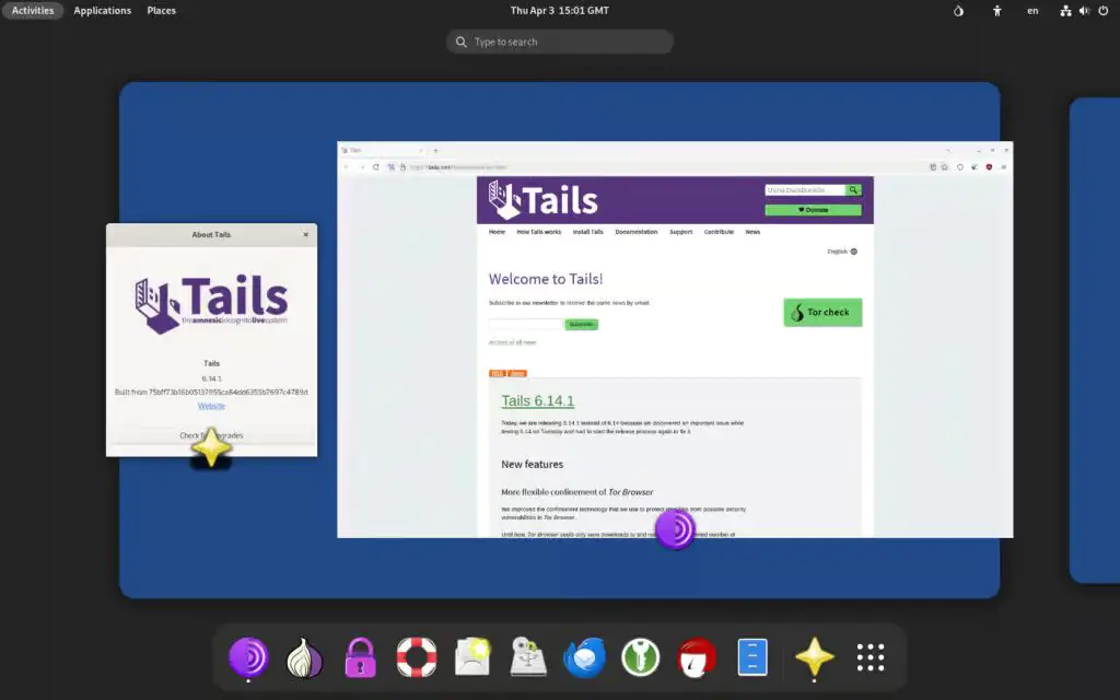 3 апреля 2025 года был выпущен специализированный дистрибутив Tails 6.14.1, ориентированный на обеспечение конфиденциальности, основанный на Debian 12 и оснащённый рабочим столом GNOME 43. Этот релиз предназначен для анонимного выхода в интернет. Напоминаем, что выпуск Tails 6.0 состоялся в феврале 2023 года, а Tails 6.13 был представлен в начале марта.
