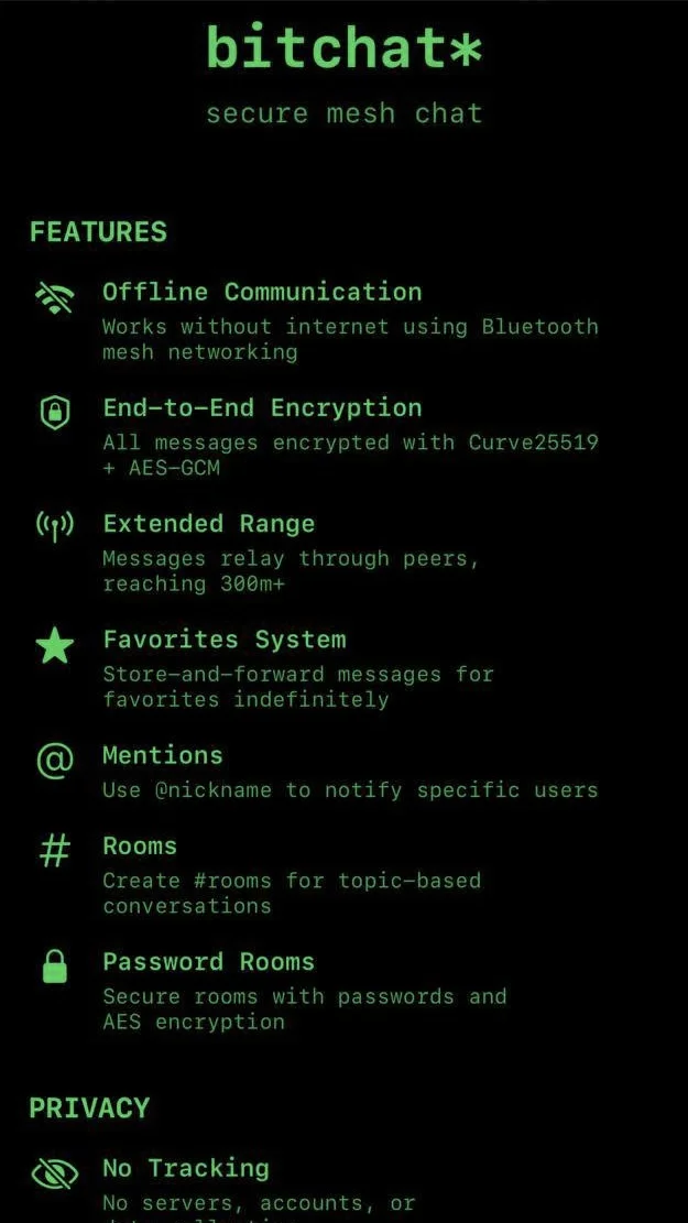 Bitchat — первый мессенджер, использующий BLE для создания mesh-сети из подключённых устройств. Каждое устройство одновременно выступает и в роли сервера, и клиента. Сообщения пересылаются от одного смартфона к другому в зашифрованном виде — до тех пор, пока не достигнут адресата.