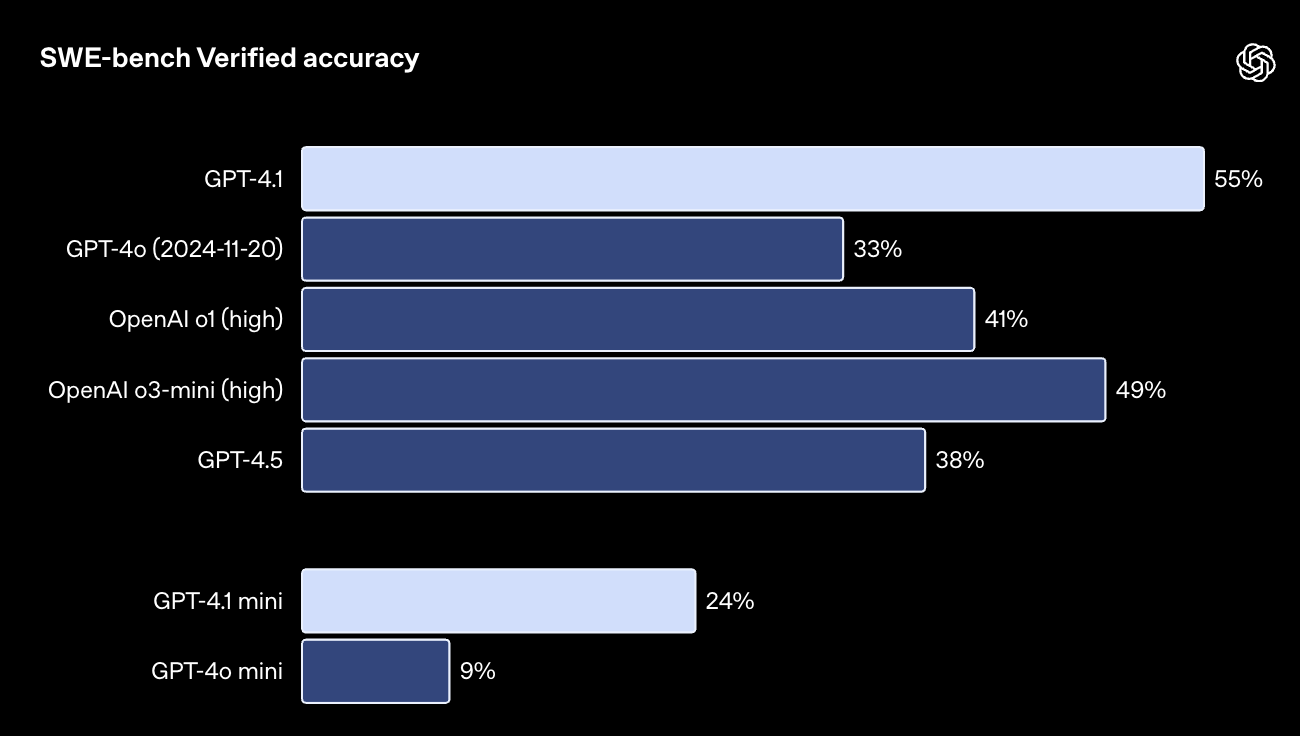 - GPT-4.1 добилась рекордных 54,6% на тесте SWE-bench Verified, превзойдя результат GPT-4o на 21,4%.