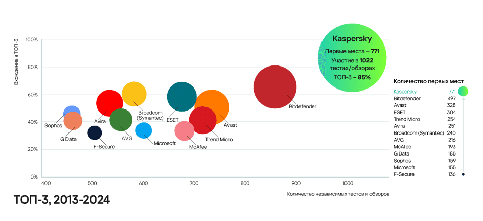 Решения компании были задействованы в 95 сравнительных испытаниях, из которых 91 завершилось победой, а в 92 случаях продукты вошли в тройку лучших. Доля попаданий в топ-3 составила рекордные 97% — самый высокий результат с начала отслеживания метрики в 2013 году. Это уже 12-й год подряд, когда компания демонстрирует наивысшие показатели по числу призовых мест.