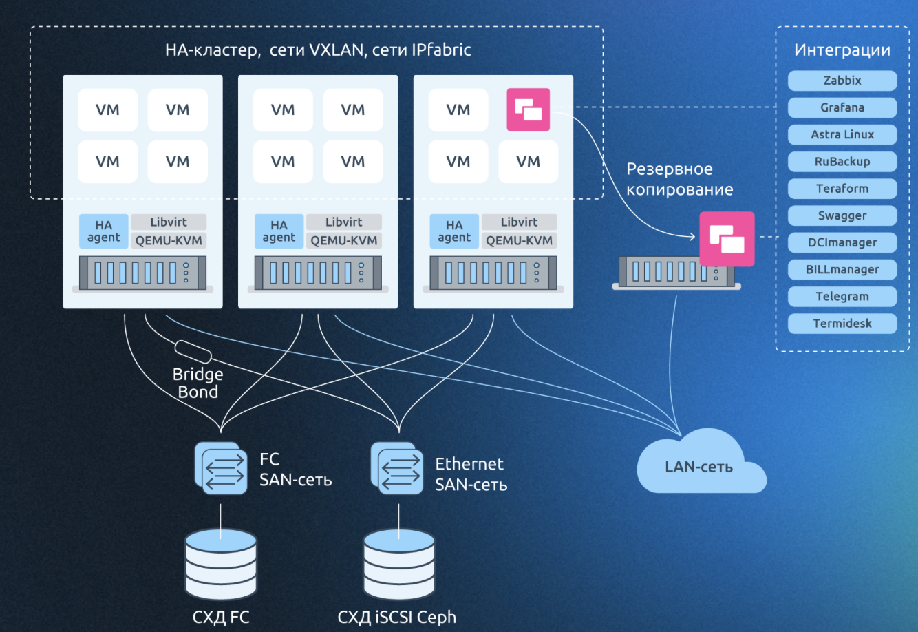 VMmanager позволяет организовать изолированную виртуальную инфраструктуру и абстрагироваться от физического оборудования. SDN-фабрика разворачивается на основе IP-fabric, VxLAN, iBGP/eBGP и eVPN. Она позволяет изолировать L2-broadcast-домен, обеспечить перемещение виртуальных машин между гео-изолированными ЦОДами без смены адресации.